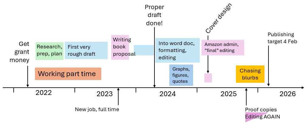Publishing in early February is a good idea, according to ChatGPT, which (who?) says that late winter is the best time for books like it. And I’m nervous. I am quite satisfied and proud of it, but there’s risk a of crashing and burning if it’s not a success (whatever I should count as “success”). Historically, there’s not a straightforward relationship between how proud/satisfied I am with something and how popular or well-received it is by others. That makes sense of course, it’d be strange if, when I spend years writing about something, it wasn’t the case that I’m much more interested in the topic than almost everyone else is. I’ll do what I can to make it not an anticlimax.